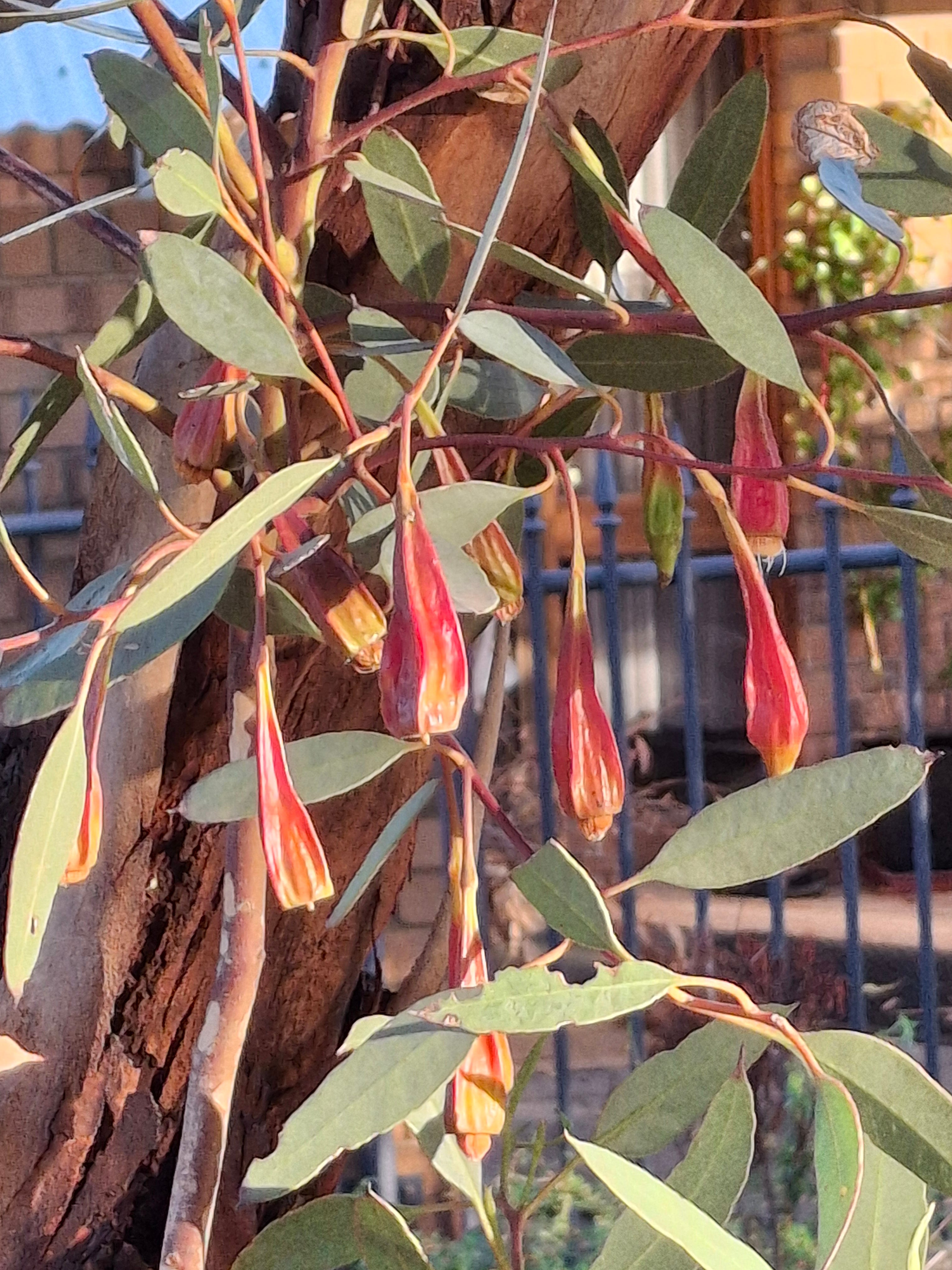the crimson pendants dripping from the eucalyptus tree in my neighbour’s garden.